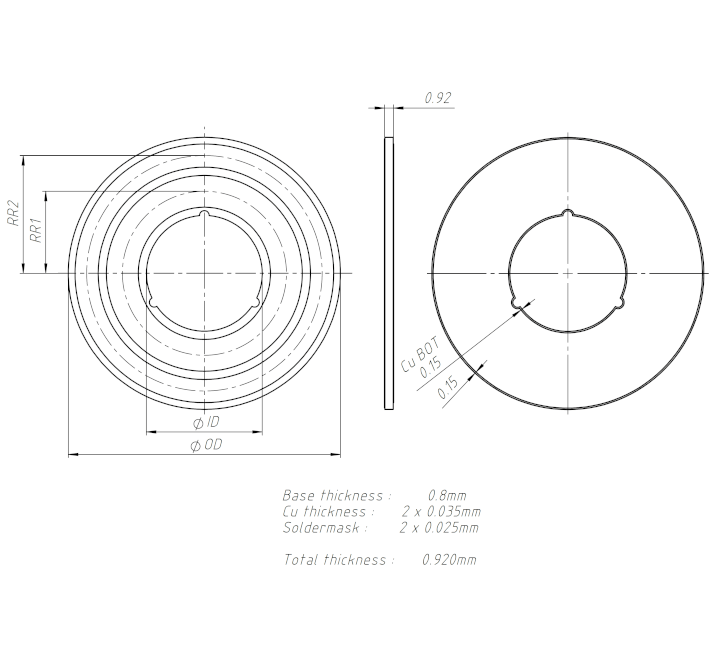Zur Ausrichtung der Scheibe sind 3 halb-Löcher mit Durchmesser 1 mm vorgesehen.