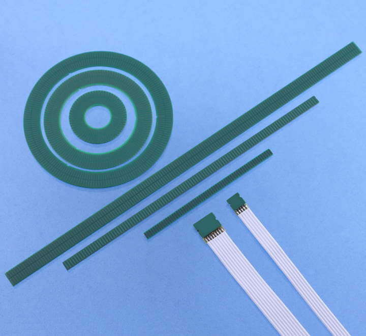 These three parameters have an important influence on the sensor performance in terms of resolution, sensor-target distance, linearity, repeatability, maximum speed etc. POSIC has developed a series of targets for optimal performance in combination with its sensors/encoders. These targets consist of a Printed Circuit Board (PCB) with copper stripes and come in the form of codewheels for rotary applications and scales for linear applications. |